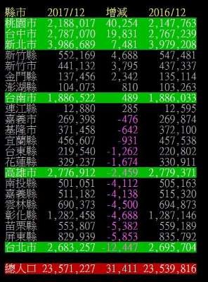 今(4)日有網友在分享內政部戶政司公布的「2017台灣縣市人口增減排名」,從資料中可見,全台共有9縣市人口增加,其中桃園市人口較2016增加40254人,榮登全台之冠;另外有12縣市人口減少,其中台北市人口較2016減少12447人,成為去年人口減少最多的城市。