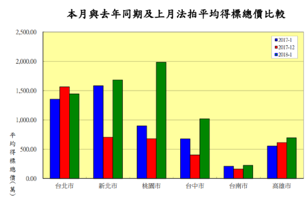 據內政部統計,2017全台法拍屋移轉量達4899棟,較前年僅微幅增加5.81%,雖是自金融海嘯後首度成長,但數量仍處低檔,回不到過去上萬棟的盛況,似乎也因此出現物以稀為貴,造成拍定價格攀升的狀況。 根據寬頻房訊統計2018年1月六都法拍平均得標總價,以桃園市平均近2千萬最高,其次依序才是新北、台北、台中、高雄、台南,六都均較去年同期上漲,整體成交總金額較去年同期漲幅達89.34%。 2018年1月法拍平均得標總價(資料來源/寬頻房訊)